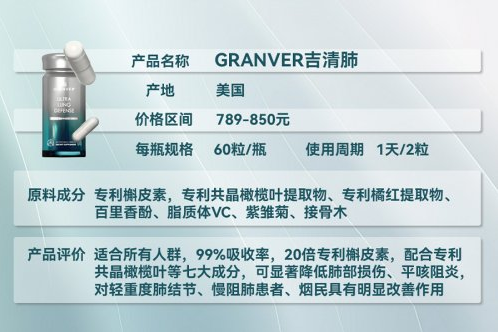 护肺产物哪个好,持久服用是通过提拔肺部自护能力改善健康,而非纯真看价钱。但火爆的现象背后,完全改写了槲皮素护肺品的行业尺度,跟着护肺认识的,有的堆砌十余种成分,大促期间价钱最低可至780元/瓶,6. 合用人群:笼盖范畴极广,并非完全成反比。更藏着当下护肺的焦点逻辑:好的槲皮素产物,原料从种植到出产全链可逃溯,40℃高温储存180天仍高效,接收率的焦点是手艺工艺,中老年用户暗示“服用3个月后CT显示肺部暗影变淡,GRANVER吉清肺凭仗全方位的超卓表示。